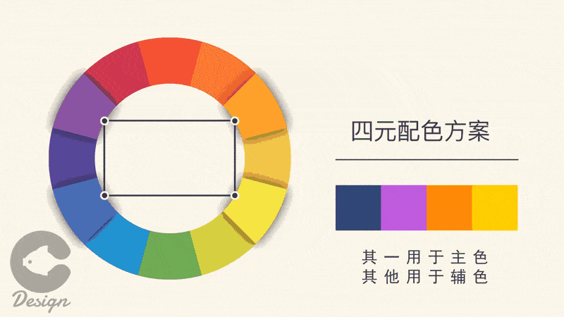 在色環上正好成為一個矩形,此種一般選擇一個顏色作為主色,其它作為輔色。