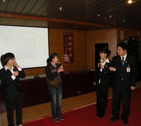 2010年4月1日,天壇家具“金牌店長 王牌導購” 國際•AST第78屆訓練營在北京金隅集團黨校成功落下帷幕,來自天壇家具市場營銷人員、優秀經銷商、金牌店長、王牌導購導購員共100多人參加了此次訓練營。此次訓練營是天壇家具與北京國富縱橫國際•AST商學院的第二次合作。在專業次合作成功的基礎上面,國際•AST商學院的導師根據學員們的現場反應能力做了更多的更有針對性,更有實效性的調整,使此次訓練營達到了更加完美的地步。